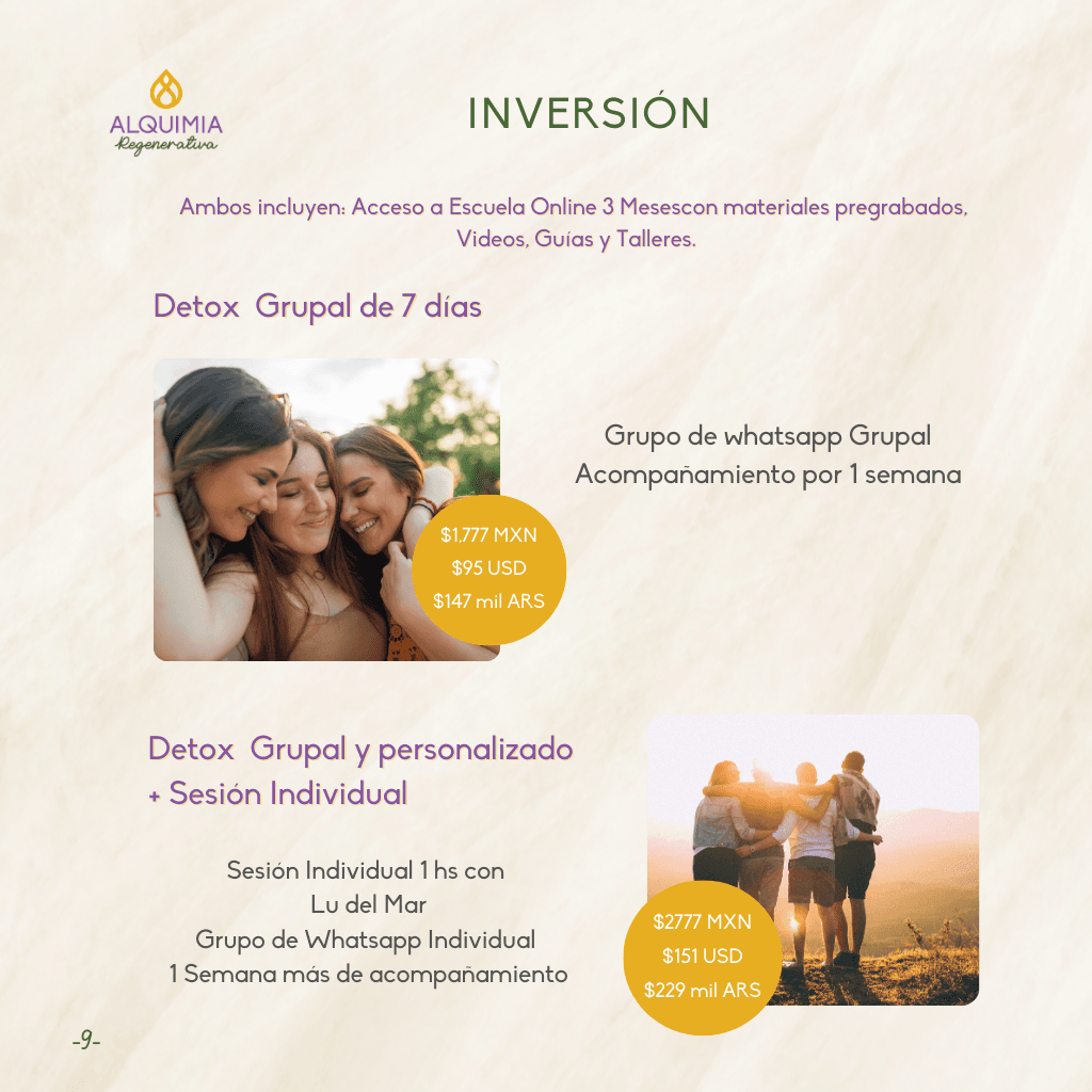 Detox Grupal y personalizado + Sesión Individual + Acompañamiento 1 semana más: 2777 mxn / 151 usd / 229 mil ars