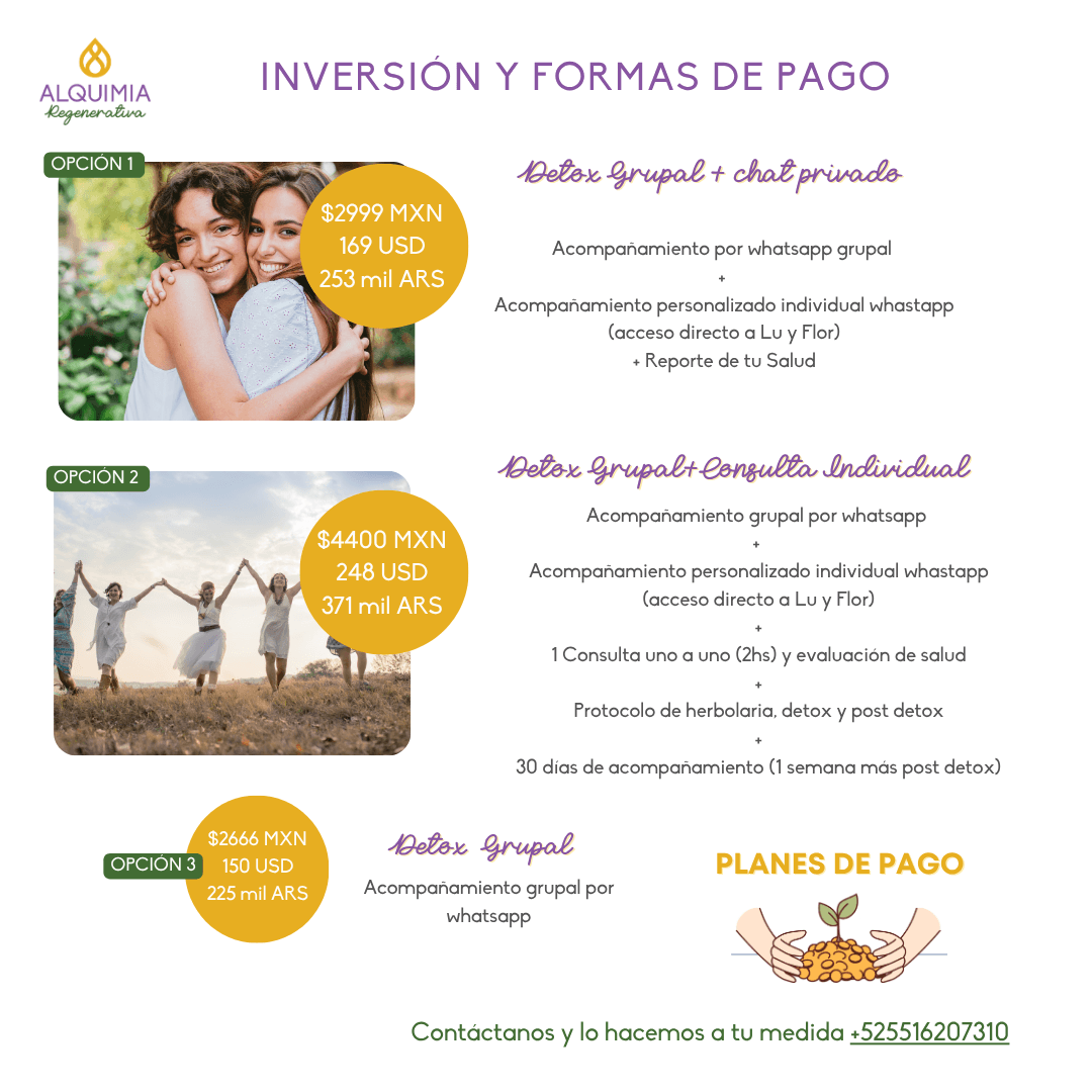 Contáctanos vía WhatsApp +525576207310 para ayudarte a elegir el detox que más se ajusta a tus necesidades y el modo de pago