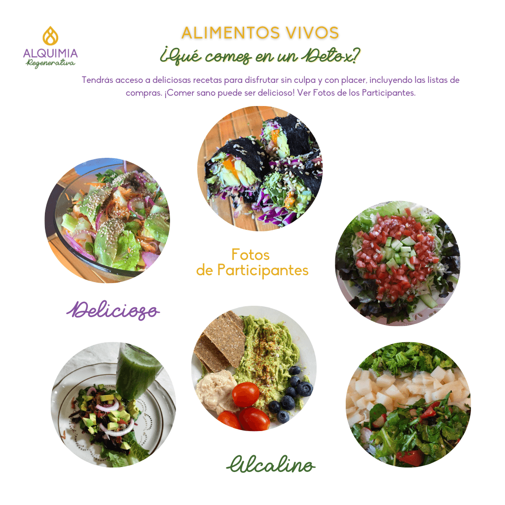 • Semanas 6, 7, 8: Alimentación consciente, opciones alcalinas de origen vegetal más flexibles (totalmente crudas o algunas cocidas), mapa de alimentos (qué alimentos funcionan mejor). Sanar la relación con la comida, la autoimagen y los patrones de alimentación emocional.