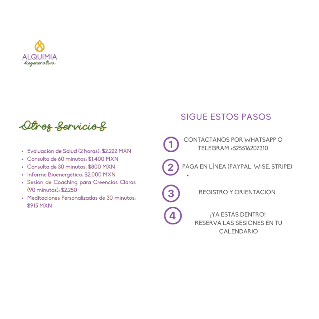 • Coaching de Reprogramación de Creencias (3): Son sesiones de transformación profunda de más de 90 minutos, para eliminar las creencias subyacentes que están causando problemas de salud y síntomas o patrones que ya no te sirven.