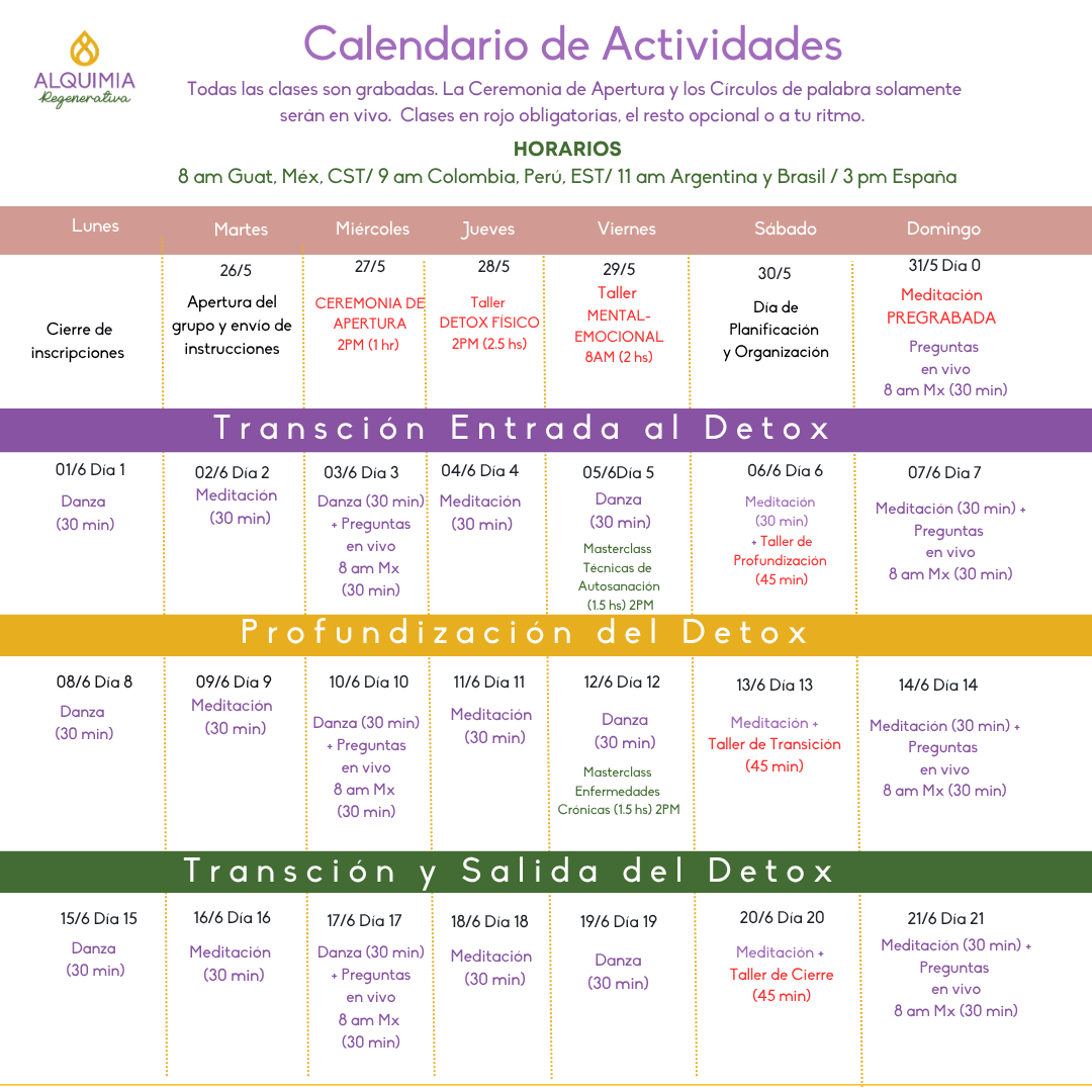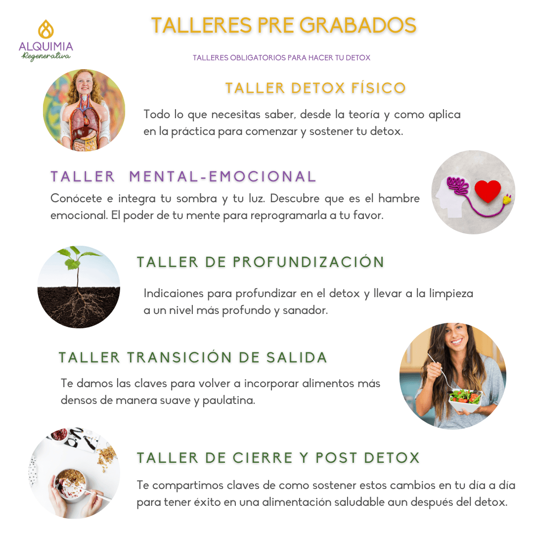 – Fechas: Miércoles 27 de Mayo, comienzan los talleres. El día 1 de detox es el lunes 1/6