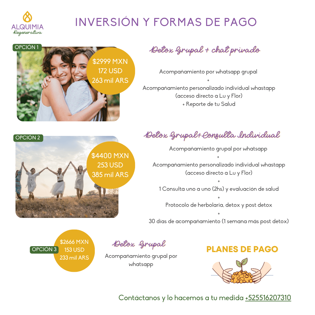 1- Grupal personalizado+chat privado $2,999 MXN / $172 USD / 263 MIL ARS, 2- Detox Grupal+Consulta Individual $4,400 MXN / $253 USD / 385 MIL ARS, 3 – Detox grupal $2,666 MXN / $153 USD / 233 MIL ARS